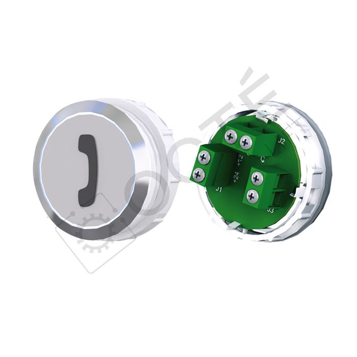 Bouton VEGA Achille Cat. 1 (EN81-71) pour boîtes à boutons cabine TOPAZ. Version bornier à vis 12/24V, raccordable à toute armoire acceptant une entrée contact sec, adapté au remplacement à l’identique ou pour remplacer un bouton non antivandale.