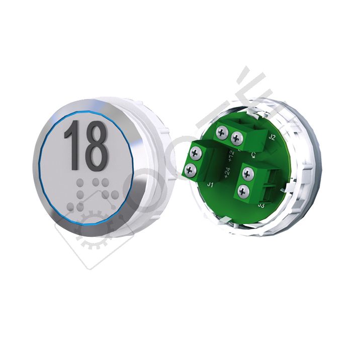 Bouton VEGA Achille Cat. 1 (EN81-71) pour boîtes à boutons cabine TOPAZ. Version bornier à vis 12/24V, raccordable à toute armoire acceptant une entrée contact sec, adapté au remplacement à l’identique ou pour remplacer un bouton non antivandale.