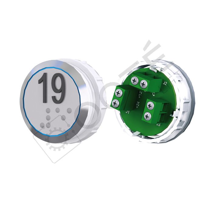Bouton VEGA Achille Cat. 1 (EN81-71) pour boîtes à boutons cabine TOPAZ. Version bornier à vis 12/24V, raccordable à toute armoire acceptant une entrée contact sec, adapté au remplacement à l’identique ou pour remplacer un bouton non antivandale.
