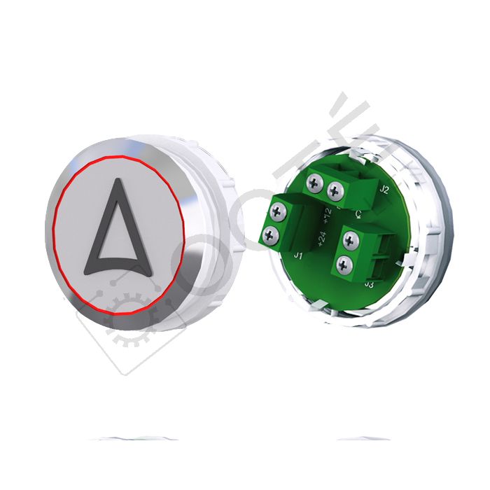 Bouton VEGA Achille Cat. 1 (EN81-71) pour boîtes à boutons palière TOPAZ. Version bornier à vis 12/24V, raccordable à toute armoire acceptant une entrée contact sec, adapté au remplacement à l’identique ou pour remplacer un bouton non antivandale.