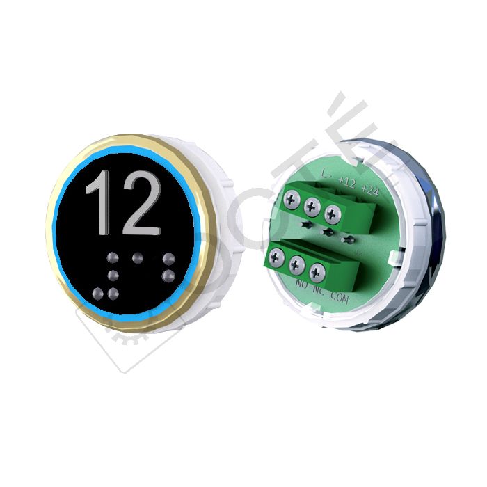 Bouton VEGA Venus XL pour boîtes à boutons cabine TOPAZ. Version bornier à vis 12/24V, raccordable à toute armoire acceptant une entrée contact sec, adapté au remplacement à l’identique.