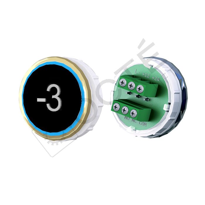 Bouton VEGA Venus XL pour boîtes à boutons cabine TOPAZ. Version bornier à vis 12/24V, raccordable à toute armoire acceptant une entrée contact sec, adapté au remplacement à l’identique.