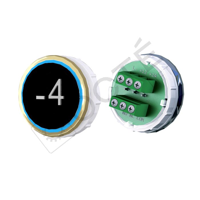 Bouton VEGA Venus XL pour boîtes à boutons cabine TOPAZ. Version bornier à vis 12/24V, raccordable à toute armoire acceptant une entrée contact sec, adapté au remplacement à l’identique.