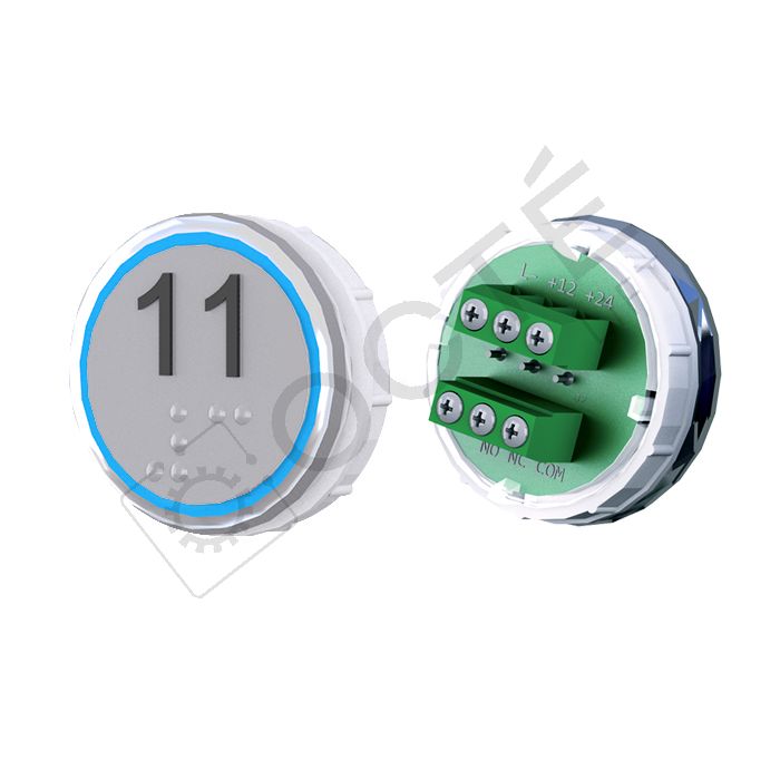 Bouton VEGA Venus XL pour boîtes à boutons cabine TOPAZ. Version bornier à vis 12/24V, raccordable à toute armoire acceptant une entrée contact sec, adapté au remplacement à l’identique.