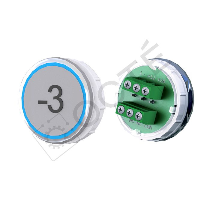 Bouton VEGA Venus XL pour boîtes à boutons cabine TOPAZ. Version bornier à vis 12/24V, raccordable à toute armoire acceptant une entrée contact sec, adapté au remplacement à l’identique.
