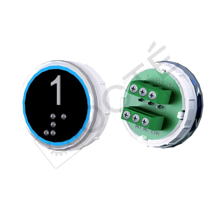 Bouton VEGA Venus XL pour boîtes à boutons cabine TOPAZ. Version bornier à vis 12/24V, raccordable à toute armoire acceptant une entrée contact sec, adapté au remplacement à l’identique.