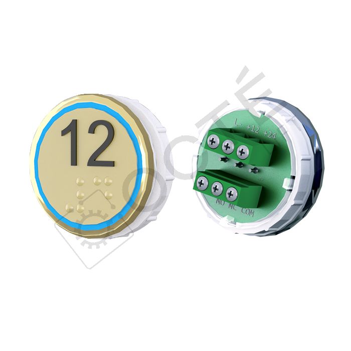 Bouton VEGA Venus XL pour boîtes à boutons cabine TOPAZ. Version bornier à vis 12/24V, raccordable à toute armoire acceptant une entrée contact sec, adapté au remplacement à l’identique.