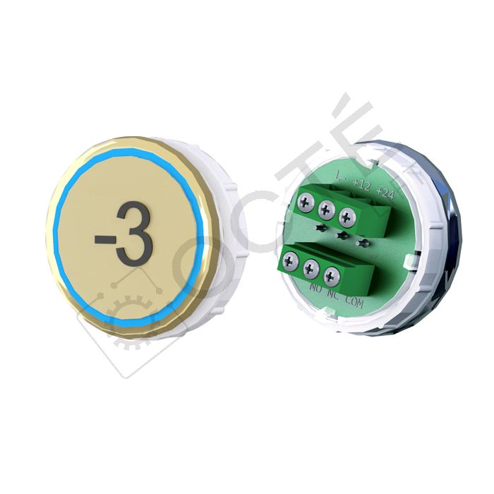 Bouton VEGA Venus XL pour boîtes à boutons cabine TOPAZ. Version bornier à vis 12/24V, raccordable à toute armoire acceptant une entrée contact sec, adapté au remplacement à l’identique.